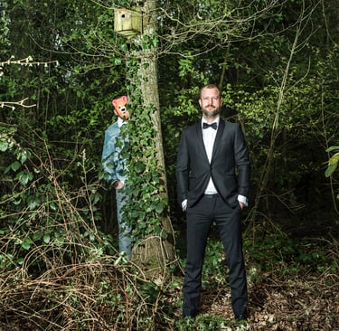 His autonomous work draws rich inspiration from Grimm's fairy tales and vibrant folk art traditions. Sebastiaan creates theatrical, animal-like figures that appear "disconnected" or searching for purpose within mystical, natural landscapes. These compositions are meticulously detailed yet harmonious, never feeling overwhelming or chaotic.